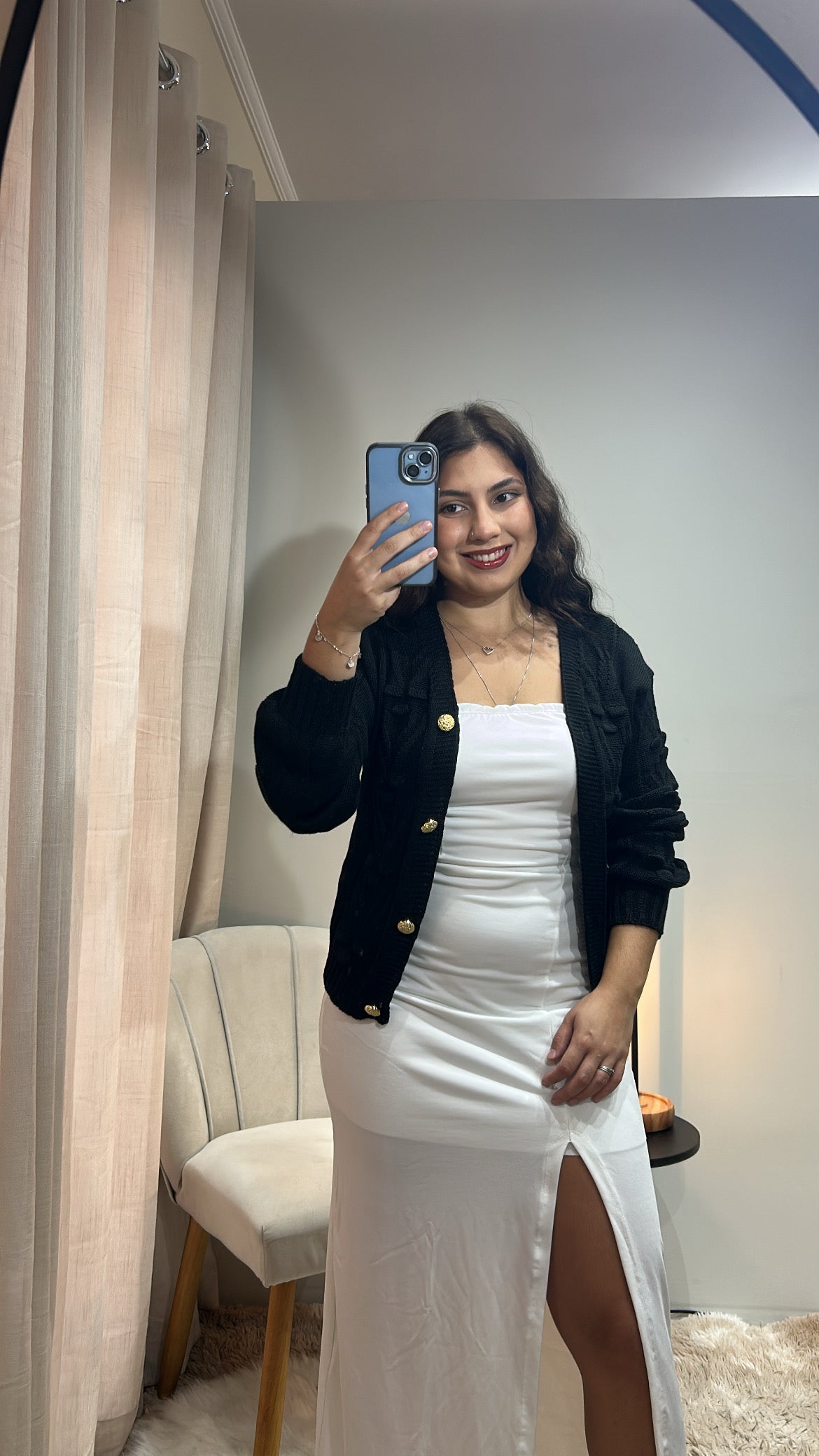 Com detalhes em relevo e botões dourados, esse cardigan é a escolha perfeita para um look elegante e quentinho. A peça traz um ar romântico e estiloso, ideal para compor visuais tanto casuais quanto mais sofisticados.