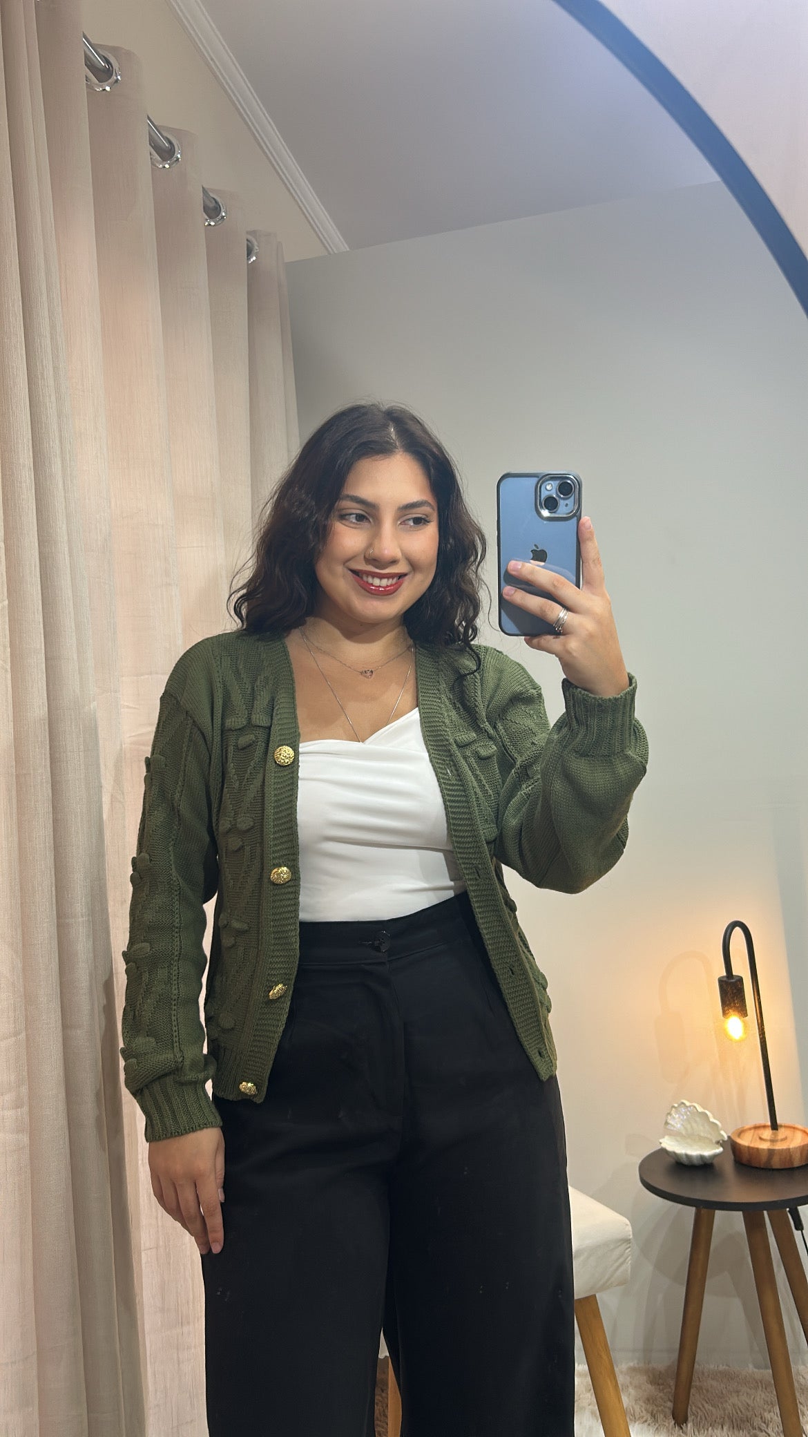 Com detalhes em relevo e botões dourados, esse cardigan é a escolha perfeita para um look elegante e quentinho. A peça traz um ar romântico e estiloso, ideal para compor visuais tanto casuais quanto mais sofisticados.