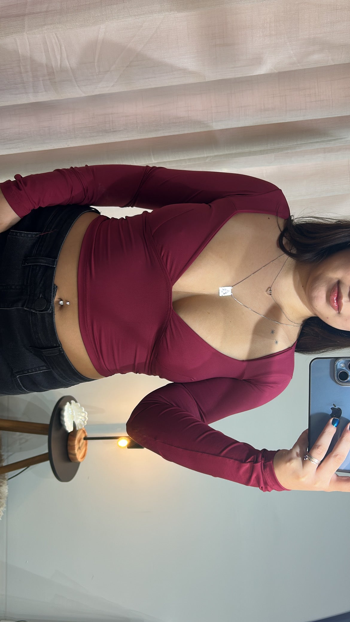Cropped Manga Longa em Poliamida com Decote Profundo - Marsala