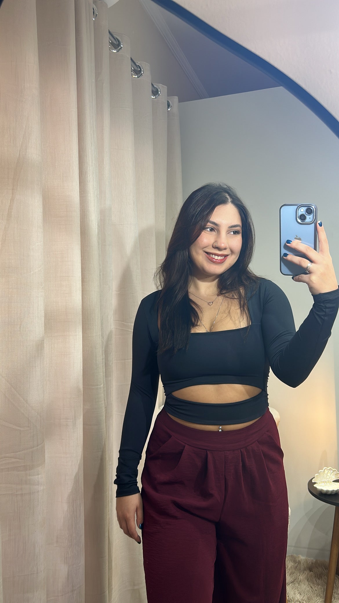 Esse cropped é confeccionado em poliamida com toque leve e elástico, oferecendo conforto e ajuste perfeito ao corpo. Com modelagem de manga longa e decote reto, o destaque fica por conta do recorte frontal abaixo do busto, que adiciona sensualidade e modernidade à peça. Ideal para quem ama um visual fashionista e marcante!